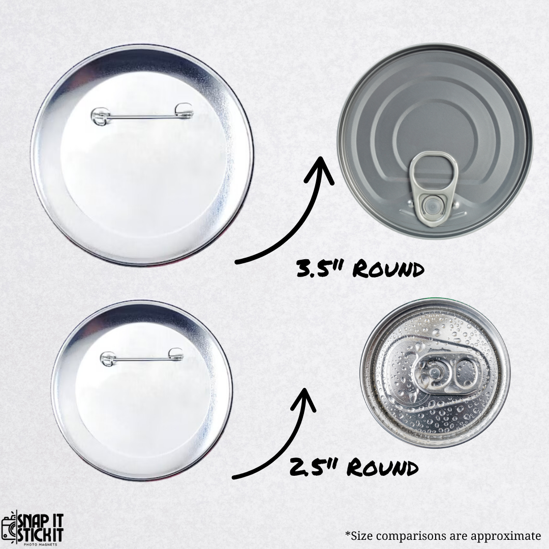 • Available in 2.5” or 3.5” metal pinback sizes
