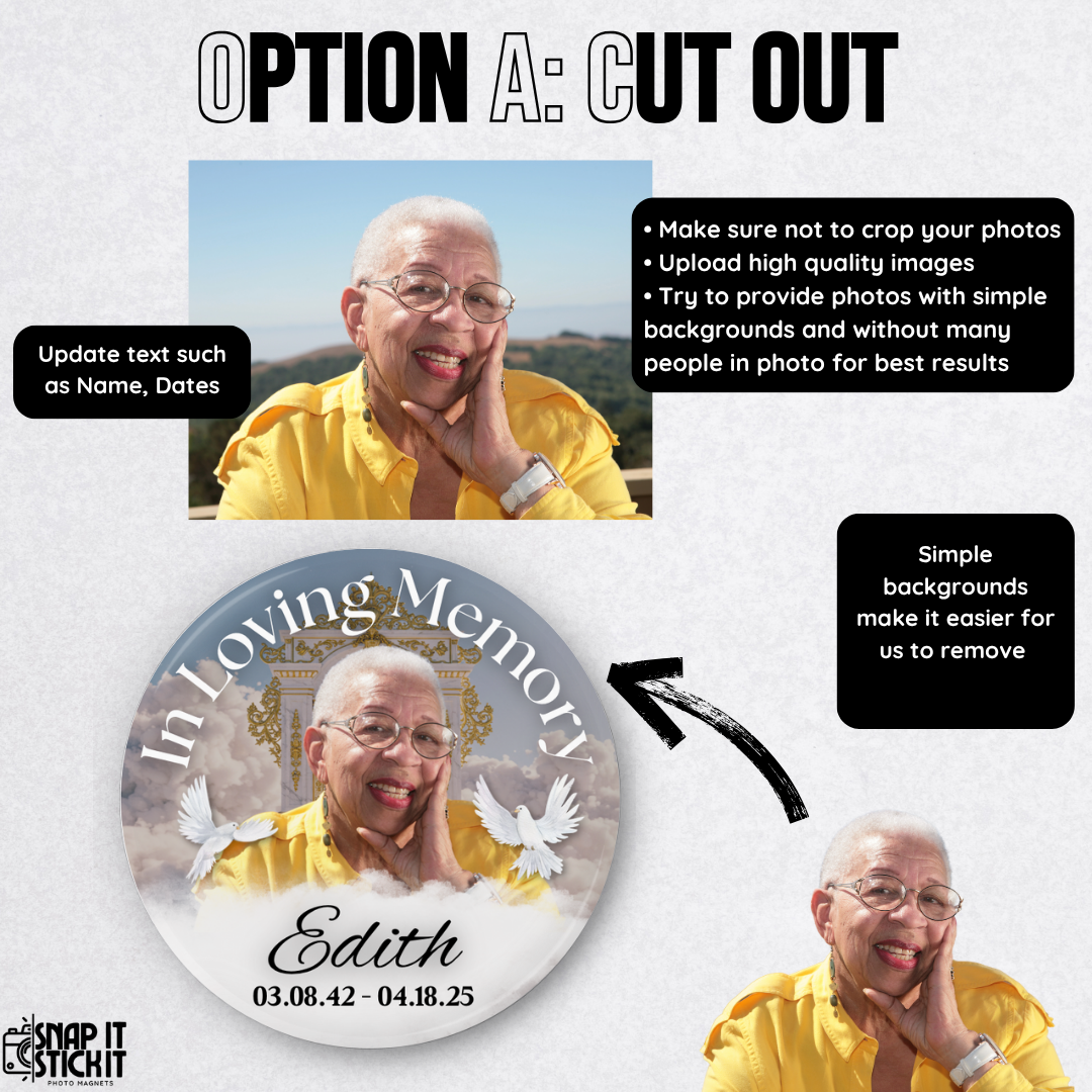 Each “In Loving Memory” pin features your loved one’s photo, name, and life dates, creating a cherished keepsake for funerals, celebrations of life, or remembrance gatherings.